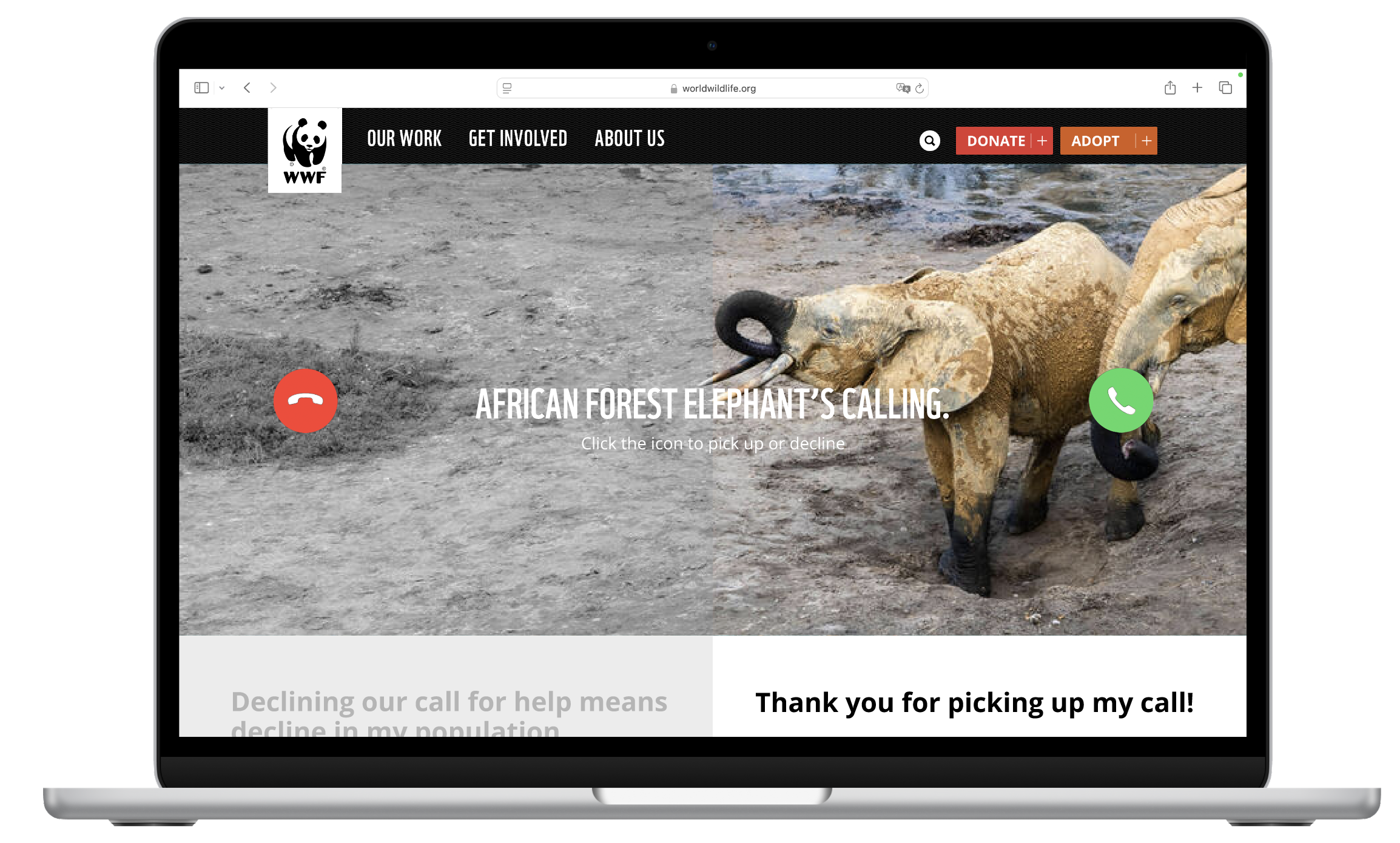 Solution: Break through to Gen Z by simulating phone calls from animals facing population decline. We use interactive ads to give people the choice and decision to play their part in fighting for the lives of endangered species.
