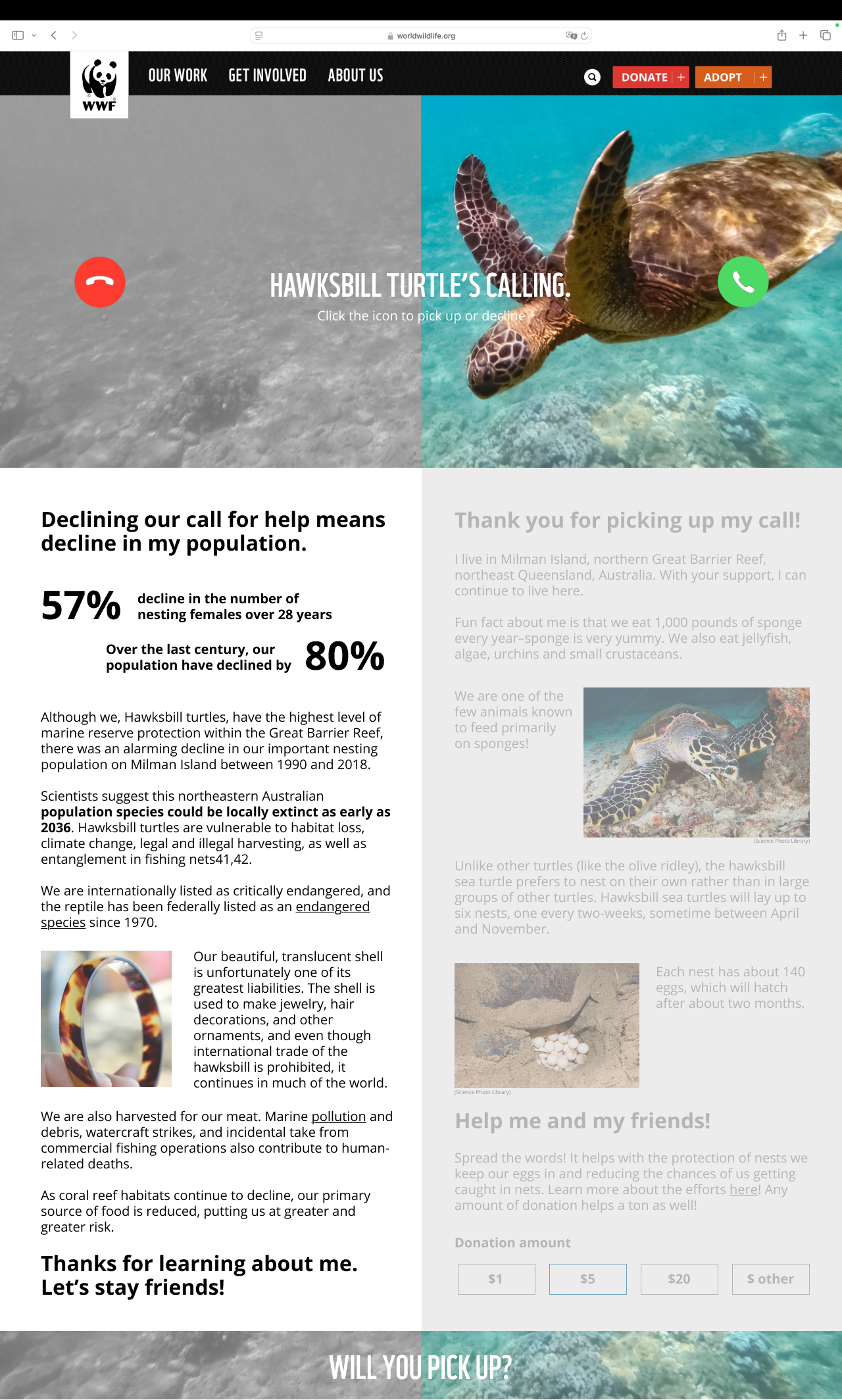 Every time you enter WWF website, different endangered animals will come up so people can learn about different animals, why they are endangered, and how the users can help. The donation at the end will be specific to each cause.